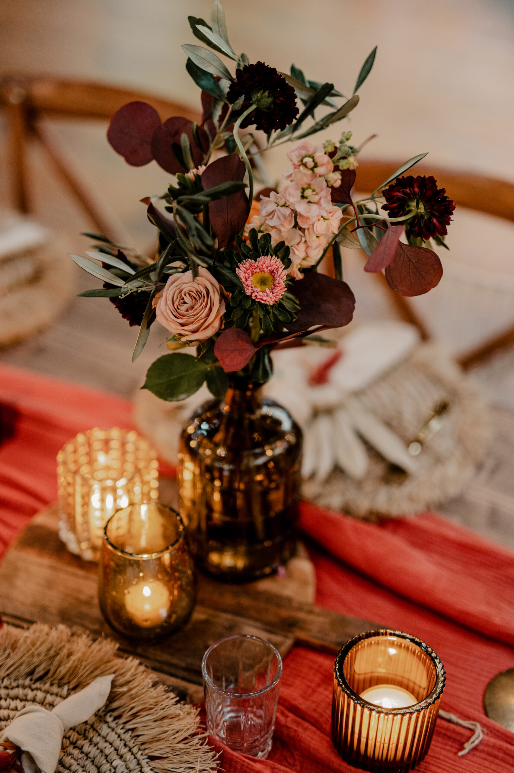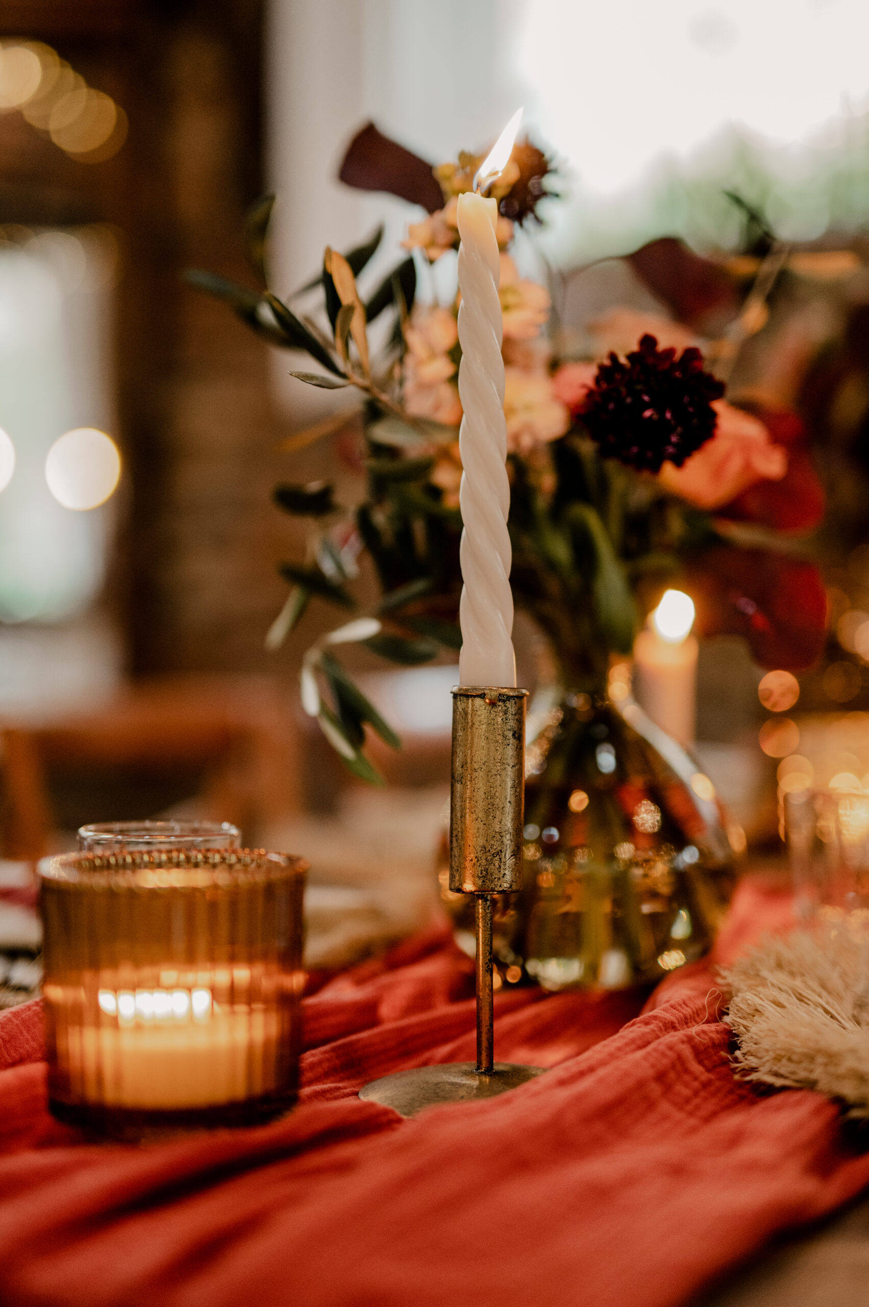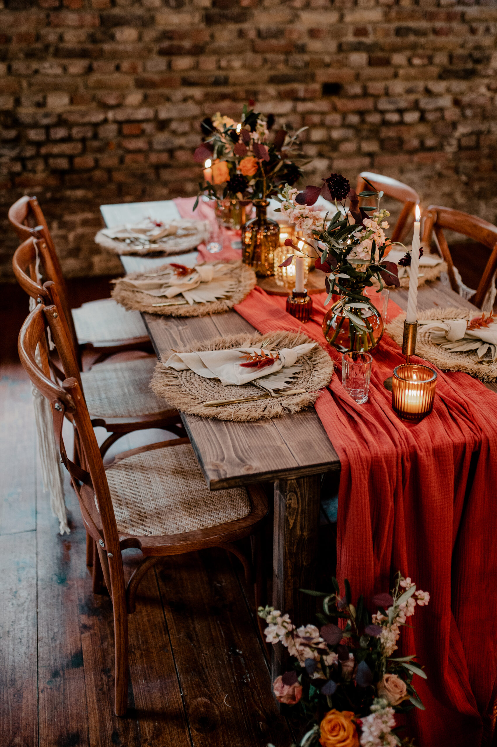 Dunkle Vasen, Rostfarbene Tischläufer & goldene Kerzenständer
