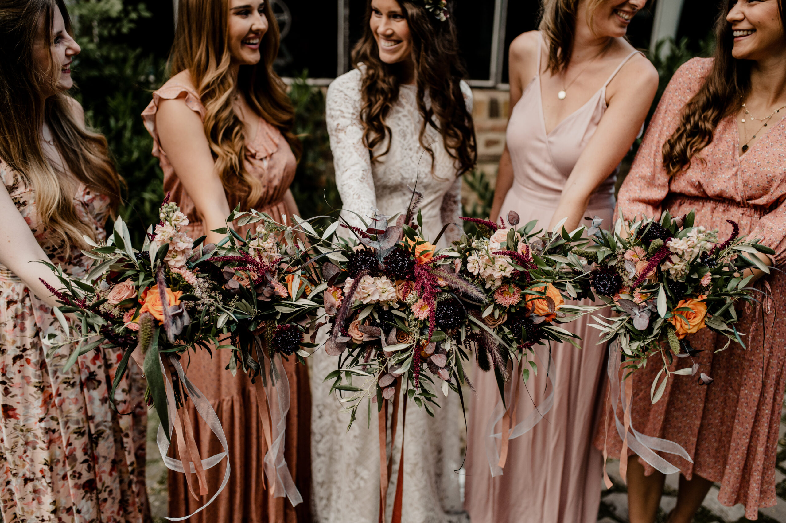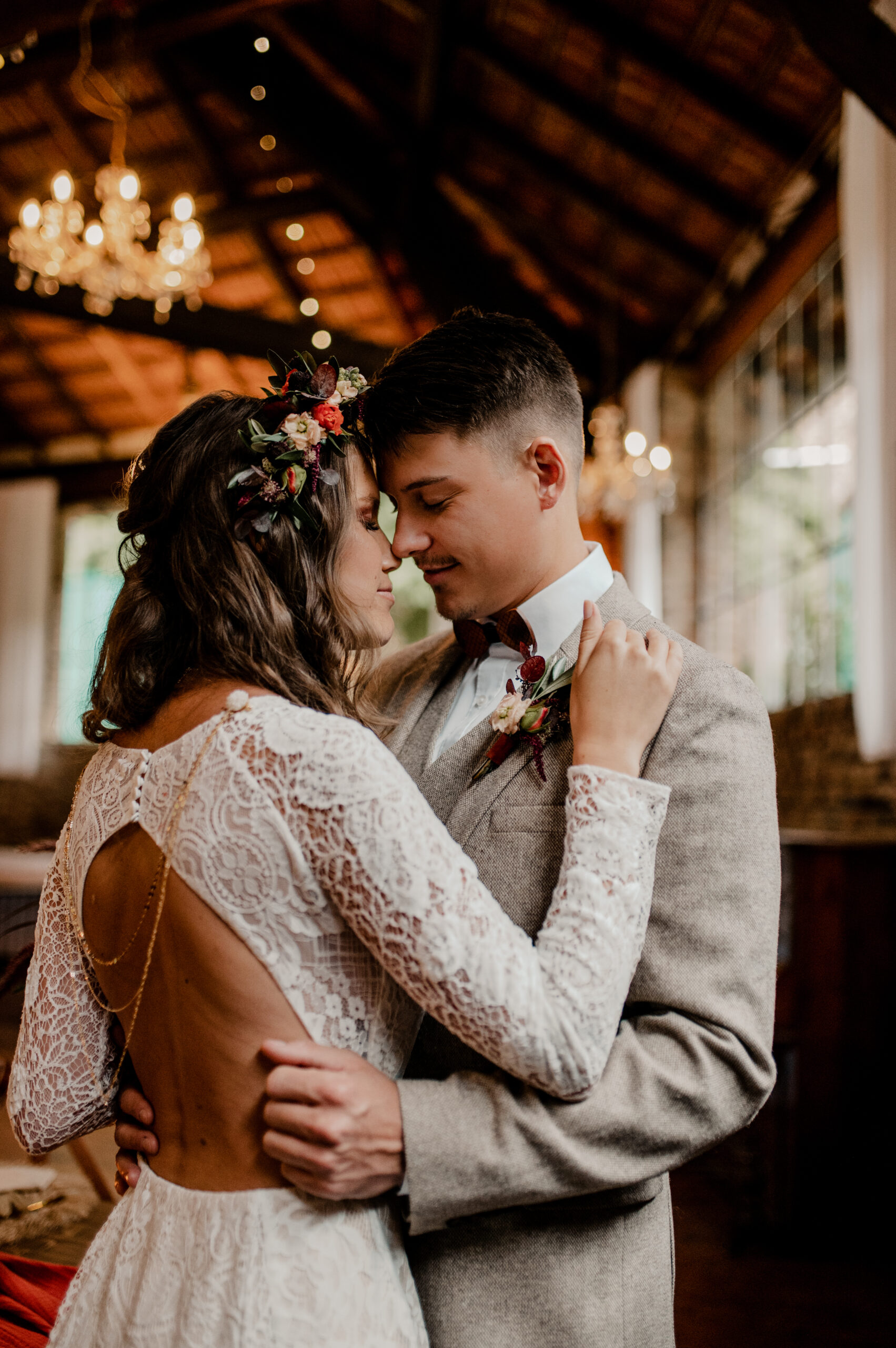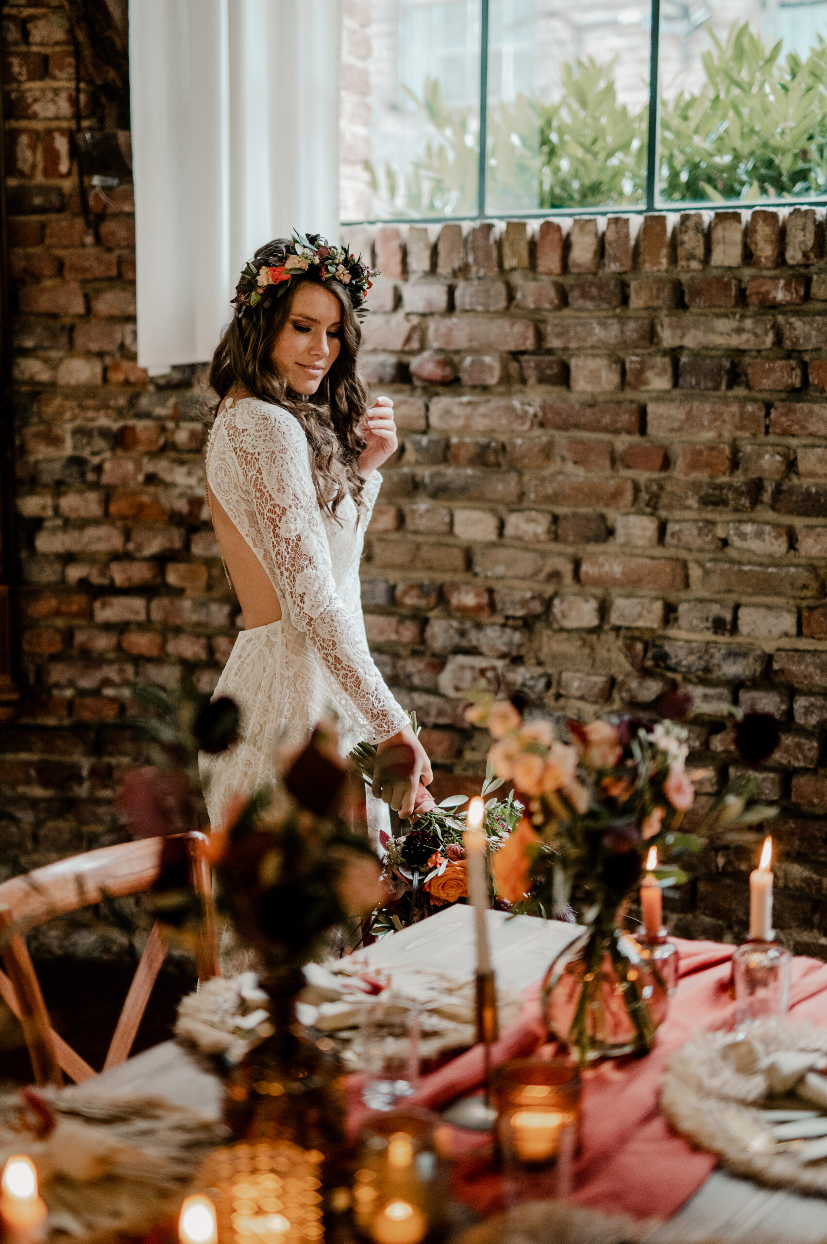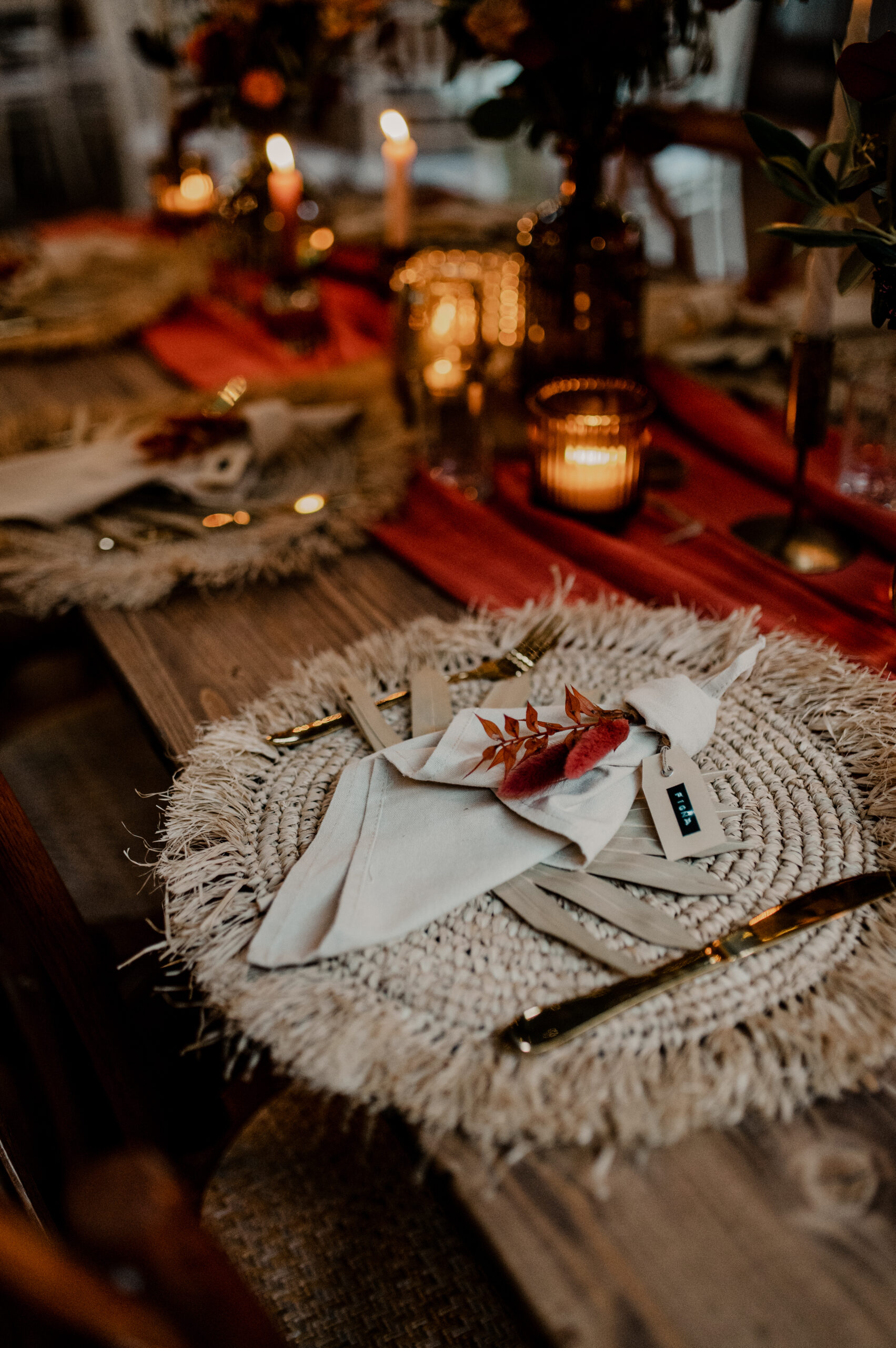 Dunkle Vasen, Rostfarbene Tischläufer & goldene Kerzenständer